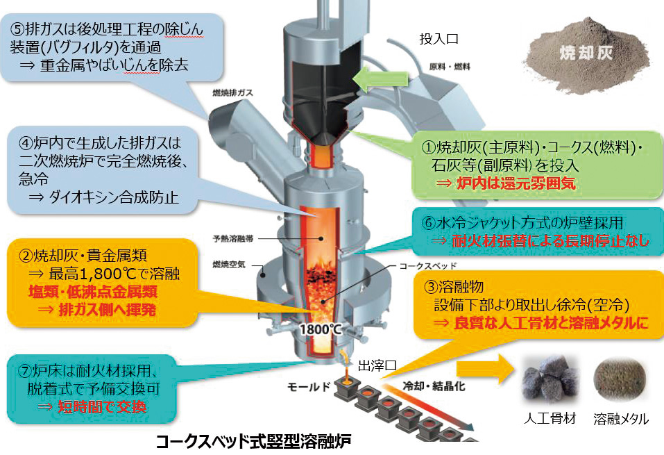 廃棄物を高温(1,800℃)で溶融処理を行い、「溶融スラグ(人工石)」と「溶融メタル」を製造している。溶融スラグは主に道路の路盤材として活用し、溶融メタルには金、銀、銅、プラチナ、パラジウム等の希少金属が含有されている。溶融メタルは秋田県の関連会社の小坂製錬㈱で、各種金属に製錬されて市場に戻す役割を担っている。